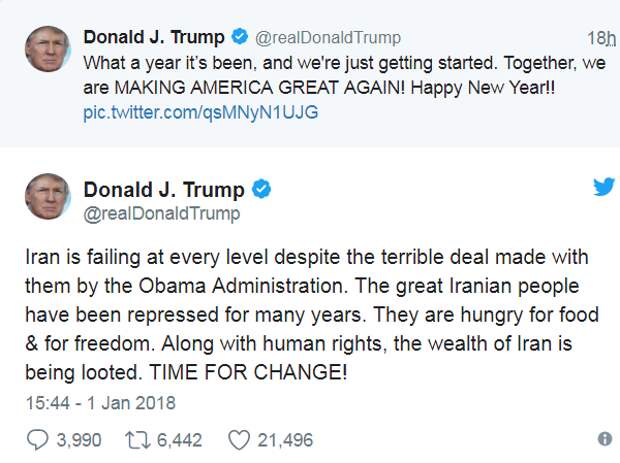 Настала пора Ирана. Дали слабину в Тегеране или Трамп пытается подготовить общественное мнение и мировое сообщество к тому, что скоро в этой стране разразится, если не гражданская война, то государственный переворот, скоро станет ясно. Пока же Трамп с пафосом заявил, что «великий иранский народ» много лет подвергался репрессиям, голодал и мучился несвободным. Прозвучали опять же типовые заявления о правах человека (первый опасный звоночек!), а затем еще и напоминание про «богатства» Ирана (второй звоночек, определяющий намерения янки).